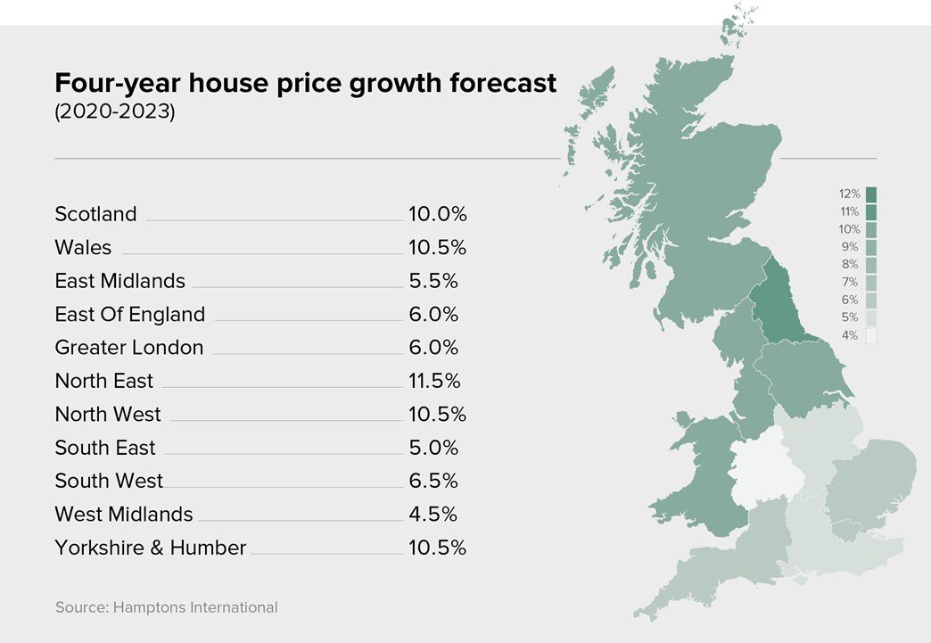 Over the next four years we expect house price growth to be strongest in all parts of the North. The top performer is forecast to be the North East, which ranks as the most affordable region and where prices have only risen 5% over the past decade. The North East also has the highest number of applicants registering for each new property, a sign of pent-up demand. By the end of 2023 we expect the North East to be the top-performing region, with prices to have risen by 11.5%.